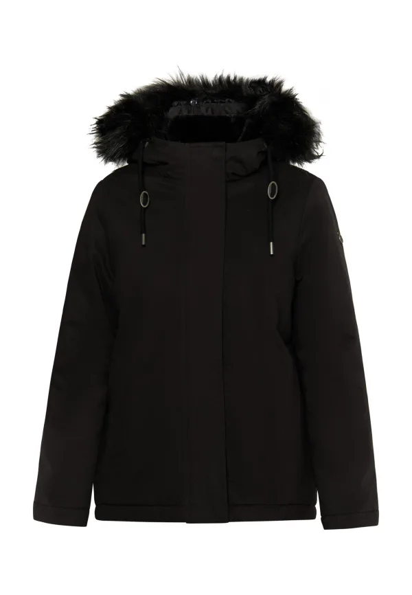 Met de zwarte gewatteerde winterjas van DreiMaster Vintage kun je ongedwongen het koude seizoen in wandelen. Het zachte katoenen materiaal heeft een behaaglijke, zachte voering van imitatiebont aan de binnenkant en de capuchon biedt ook verwarmende ondersteuning met een zwarte kraag van imitatiebont. Een verborgen ritssluiting, een klein labelplaatje op de bovenarm en de zijzakken met drukknopen maken het winterse design compleet. winterjas