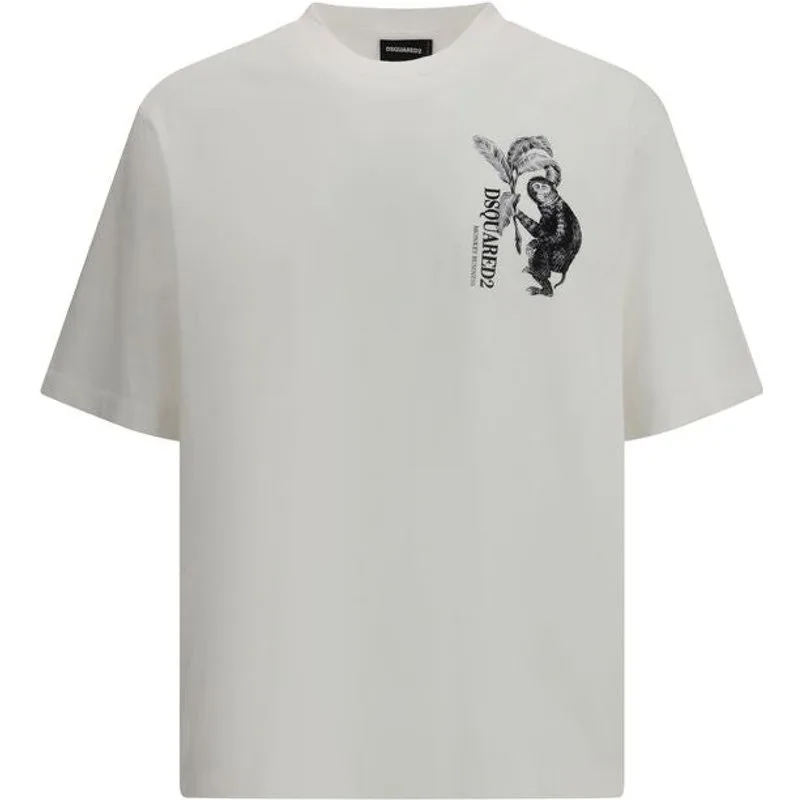 Het Monkey business T-shirt van Dsquared2 is gemaakt van zacht katoenjersey en heeft een losse pasvorm met een ontspannen uitstraling. De schone ronde hals vormt een omlijsting voor de grafische print aan de voorkant, waar een kleine aapillustratie in het bovenste gedeelte links verschijnt, wat een ironische en onderscheidende touch aan het ontwerp toevoegt. Seizoen: Lente/Zomer 26 Pasvorm: Oversized Samenstelling: 100% Katoen