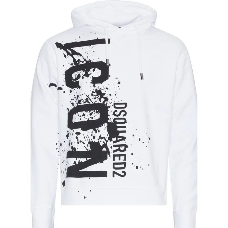 Dsquared2 Witte hoodie, 100% katoen, elastische mouwuiteinden en onderkant, coole pasvorm hoodie met icon splash-print, icon-logo, trekkoorden, normale pasvorm, gemaakt in Italië, witte hoodie
