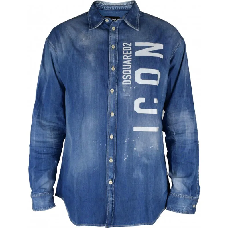 Dsquared2 blauw denim overhemd met vervaagd effect. 'Icon Dsquared2'-logo op de voorkant Knoopsluiting. 98% katoen, 2% elastaan. Gemaakt in Italië