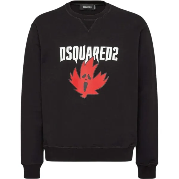 Dsquared2 Horror Maple Leaf Cool Fit Crewneck Sweatshirt Zwart, Made In Italy, 100% Katoen. Deze opvallende, in Italië vervaardigde sweatshirt combineert premium comfort met een gedurfde designuitstraling. De iconische horror-esdoornbladprint zorgt direct voor een visuele impact, terwijl de cool fit pasvorm garandeert dat de trui modern en flatterend is en moeiteloos te combineren is met je dagelijkse garderobe. Gemaakt van puur katoen, biedt deze trui ademend comfort gedurende alle seizoenen, zonder in te leveren op kwaliteit of duurzaamheid. Perfect voor wie luxe streetwear met een edgy twist waardeert. Dit Dsquared2-item tilt casual stijl naar een hoger niveau met authentiek Italiaans vakmanschap en een onderscheidend karakter waarmee je je onderscheidt