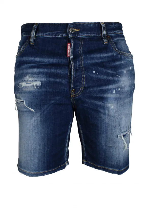 Marine Shorts Dsquared2 Donkerblauw met vervaagd effect.Gescheurd effect.Bruine logopatch op achterkant. Witte verfspatten.Drie voorzakken, twee achterzakken.Rode logopatch op gulp voor.Knoopsluiting.Gele doorstikdetails.97% katoen en 3% elastaan.