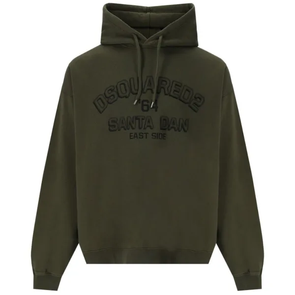 Dsquared2 groene hoodie, 100% katoen, elastische mouwuiteinden en onderkant, Santa Dan East Side-logo, trekkoorden, losse pasvorm, gemaakt in Italië
