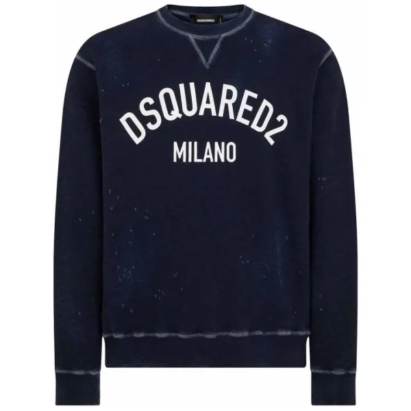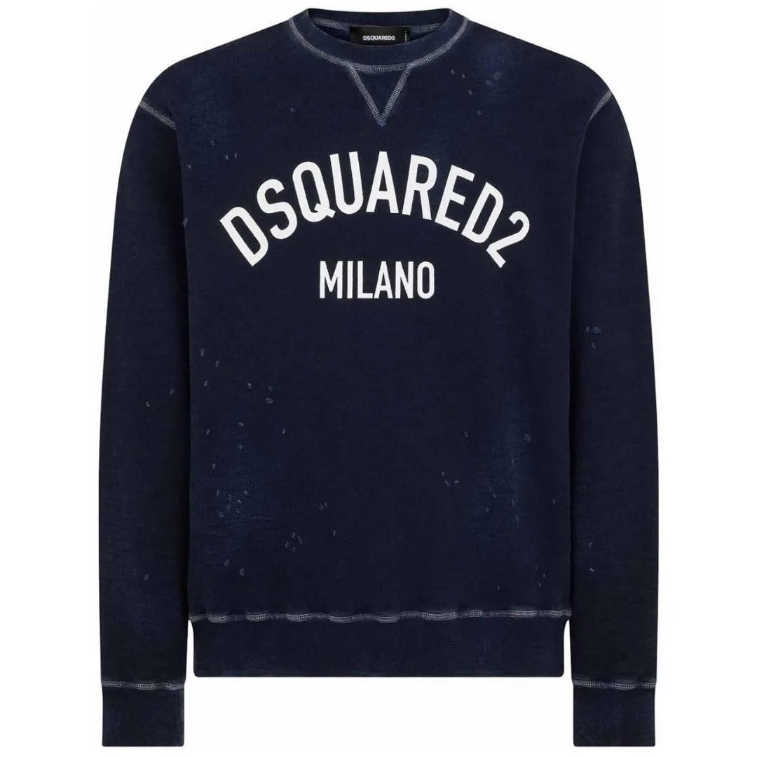 D2 marineblauw sweatshirt, 100% katoen, gemaakt in Italië, ronde hals, lange mouwen, elastische hals, mouwuiteinden en onderkant, normale pasvorm, Milano-logo, groot Dsquared2-logo