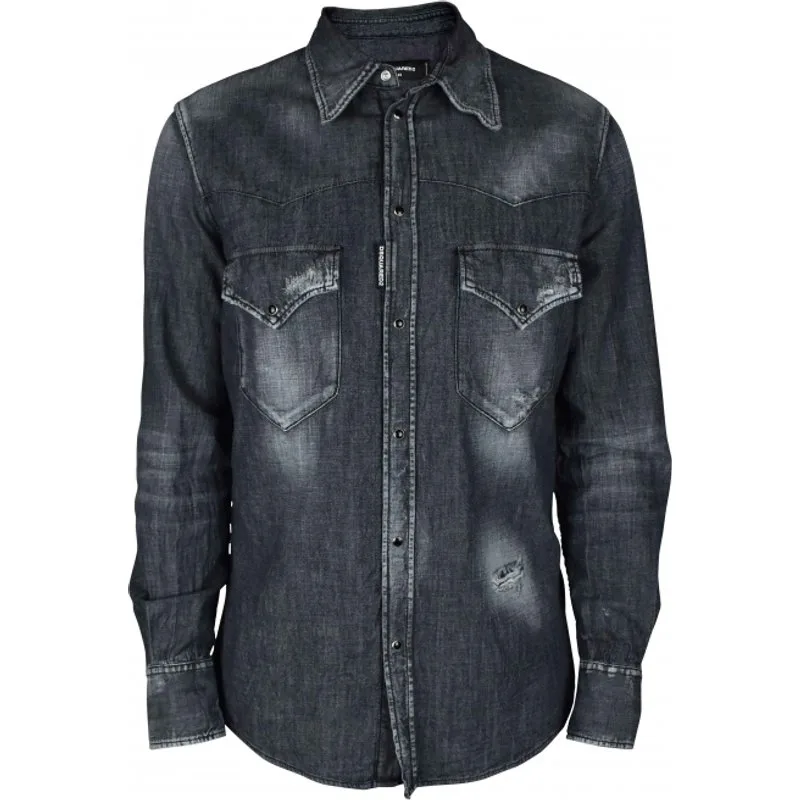 Zwart katoenen denim New Western overhemd van Dsquared2.Gewassen en versleten effect.Standaard pasvorm.Klassieke kraag.Borstzakken met zwarte drukknoopsluiting.Zwarte drukknoopsluiting en manchetten.Lange mouwen.Zwart logolabel aan de voorkant.Gemaakt in Italië.
