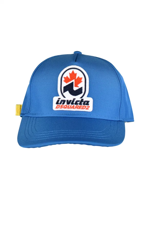 Blauwe nylon pet Dsquared2 x Invincta.Geborduurde patch in het midden.Wit geborduurde inscriptie aan de achterkant.Verstelbare gele riem aan de achterkant.