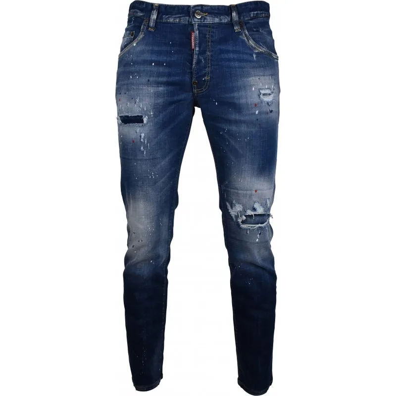 Dsquared2 blauwe katoenen skaterjeans.Vervaagd effect op de pijpen.Verfvlekken.Tranen.Knoopsluiting met rood logolabel.Rode 1964 patch op de achterkant met letters.Riemlussen.Vijf zakken.Made in Italy.