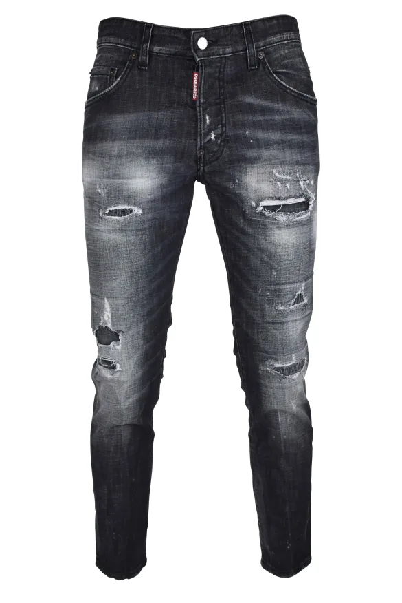 Skater Jean Dsquared2 zwart katoen.Gewassen effect op de pijpen.Scheuren op de dijen.Knoopsluiting met rood logolabel.Bruine suède achterpatch met '995'-belettering.Riemlussen.Vijf zakken.98% katoen en 2% elastaan. Gemaakt in Italië.
