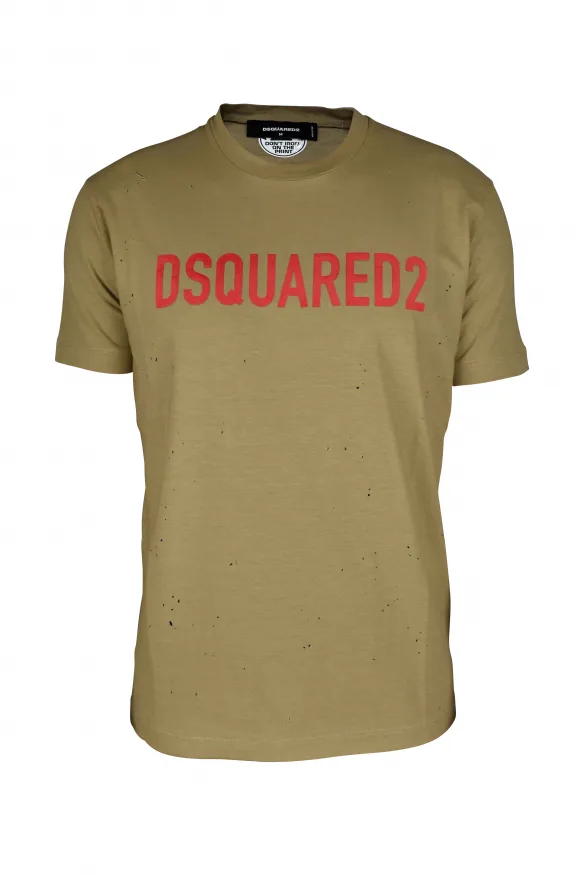 Beige katoenen T-shirt Dsquared2.Logo-inscriptie in rood midden.Korte mouwen.Rechte snit.Gemaakt in Italië.