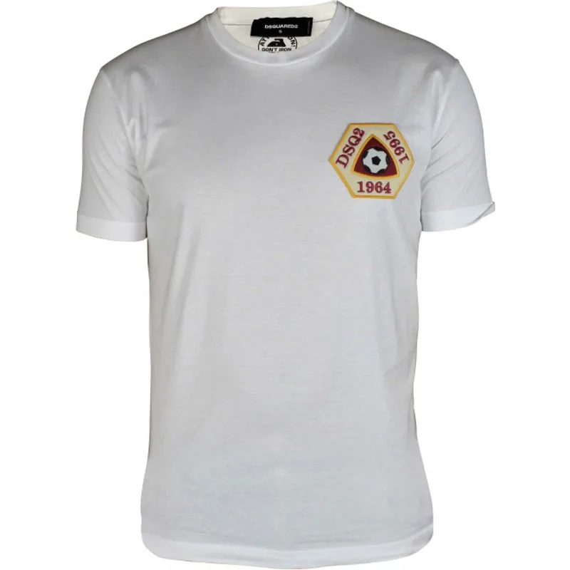 Dsquared2 T-shirt.Witte kleur.Geel en rood wapen.Korte mouwen.Ronde hals.Rechte snit.100% katoen.