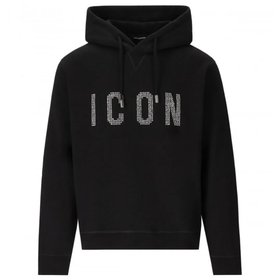 Dsquared2 zwarte hoodie, 100% katoen, elastische mouwuiteinden en onderkant, icoonontwerp met studs, gemaakt in Italië