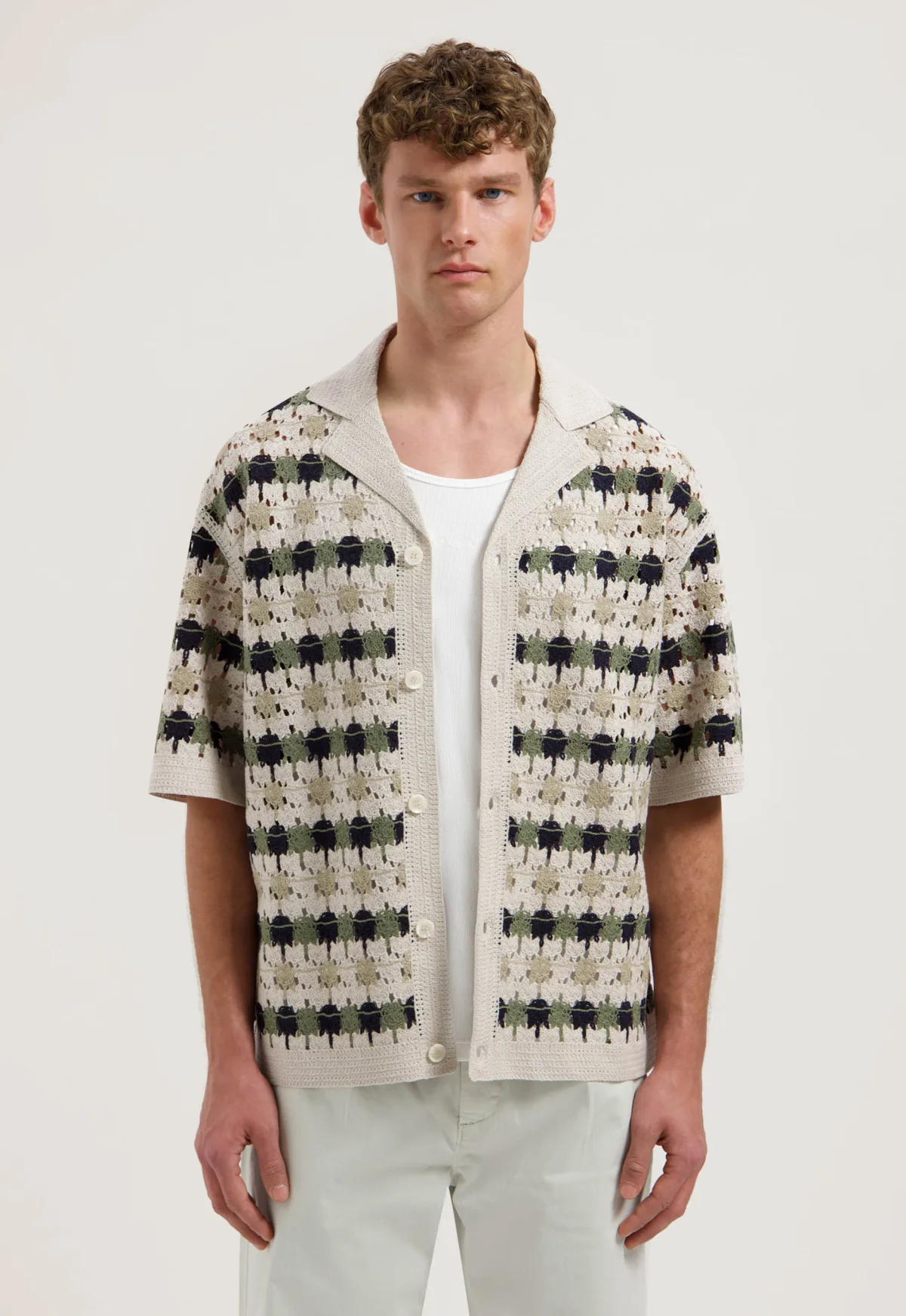 Dit is het 421001 Lonell overhemd van het merk Dstrezzed. Dit overhemd heeft een loose fit en is vervaardigd uit een unieke mix van katoen en acryl met een open crochet techniek die zorgt voor een opvallende look. De korte mouwen maken het ideaal voor warme dagen, terwijl de knoopsluiting een klassieke afwerking biedt.