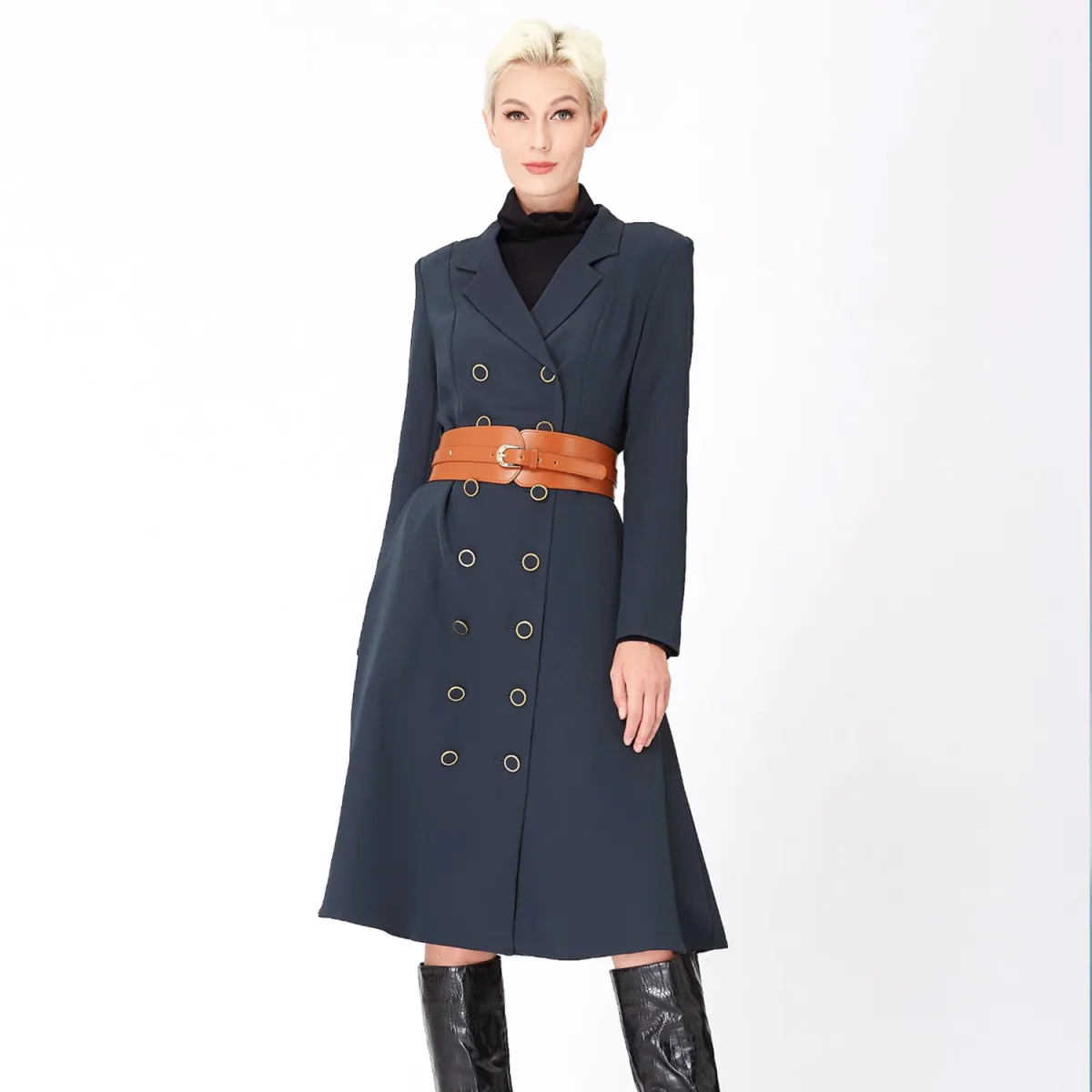 Een elegant en tijdloos item voor het middenseizoen, deze jas is gestructureerd met verfijnde details: Golden Ring-knop, fit-and-flare op maat gesneden. Een stuk dat al vele gelegenheden zowel chic als vrouwelijk is, essentieel voor elke garderobe. Om in de herfst zonder moderatie te dragen. Productdetails: • Formulier: op maat gemaakt, gesneden • Lengte: 121 cm; onder de knie • Lange mouwen • Geklassing • Dubbele knooppunten vooraan