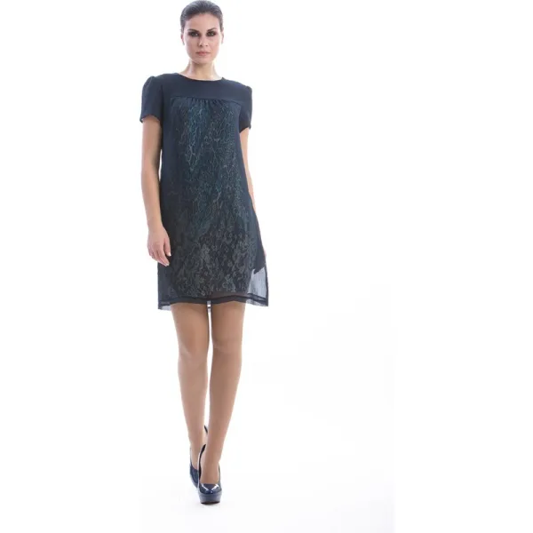 Jurk CONQUISTA met korte mouwen en een ronde hals. Dubbele doorschijnende stof bij de mouwen en borst. Op het lichaam is de binnenste stof bedrukt met een kanten patroon in blauwtinten en de buitenste laag is doorschijnende gestructureerde stof. Aan de zoom zijn de lagen gescheiden. Een subtiele A-lijn silhouet. Boven de knielengte. Het model is 1,77 m lang en draagt maat 36/S. 92% viscose, 8% elastaan + 100% polyester.