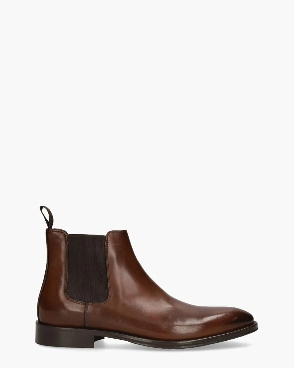 Chelseaboots 1870 voor heren van het merk Valdorini. Deze stijvolle schoen heeft een bovenwerk van soepel en glanzend bruin leer met een vintage poesting. De binnenzijde is ook in leer uitgevoerd en voorzien van een vast voetbed. De afgeronde carréneus geeft dit model een chique look. De schacht is ongeveer13 cm hoog en de hak