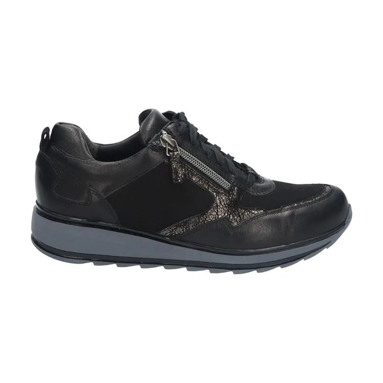 Gestroomlijnd en sportief zijn de twee termen die deze sneaker misschien wel het best omschrijven. Het bovenwerk is verrijkt met stikwerk belijningen en metallic leren inzetten die het model een luxueuze uitstraling geven. Andere opvallende details zijn de kleine treklus op de hiel, het subtiele merkstempel op de tong en de ritssluiting bij de veterrand waarmee je de schoen gemakkelijk aan- en uittrekt. Het gebied rond de voorvoet is uitgevoerd in zachte, extra flexibele materiaal tegen knellen. Deze bewezen Durea flex-toepassing zorgt ervoor dat de schoen zich direct naar de voet vormt waardoor ze ideaal zijn voor mensen met een standsafwijking van de tenen (klauwtenen en hamertenen). De sportieve zool is speciaal ontwikkeld voor een goede afwikkeling van de voet en voorzien van een medium profiel voor een goede grip. Tel daarbij op dat de zool is gemaakt van sterk, licht én flexibel materiaal en je snapt waarom dit model zeer geliefd is bij een breed publiek.Deze schoenen, met uitneembaar voetbed, artikelnummer 6261 wijdte H, van Durea