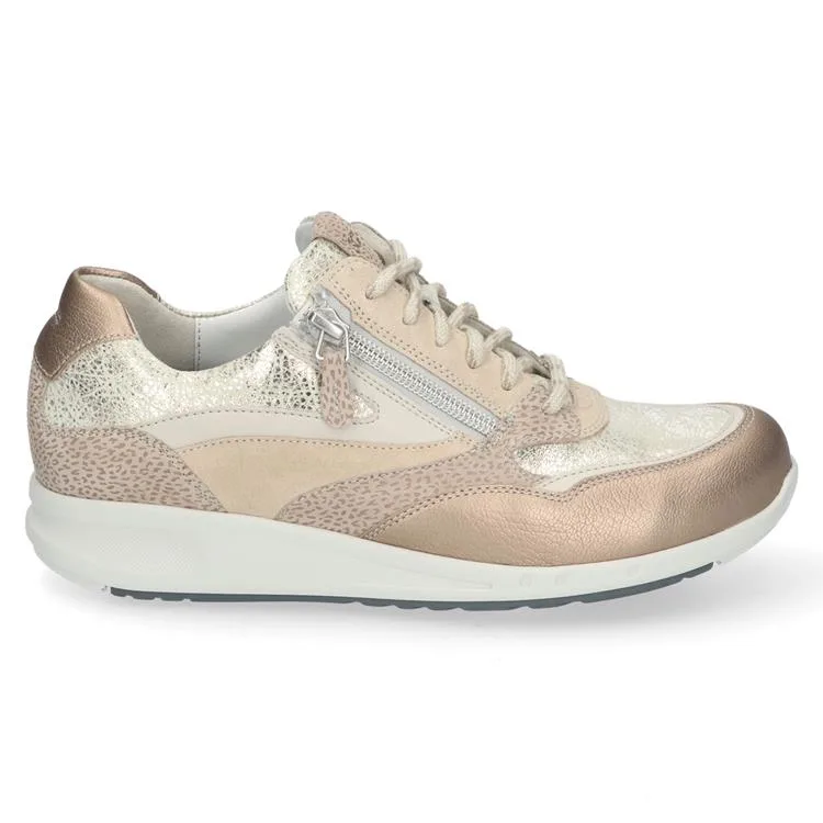 De combinatie van sportief en elegant is er een om van te houden en deze sneaker levert het bewijs. Of je nu gaat voor een casual look of een stijlvolle outfit voor kantoor, dit model tilt elke combinatie naar een hoger niveau. Het bovenwerk springt in het oog door een spannende mix van materialen, texturen en een verfijnde afwerking. De subtiele, afgeronde lijnen in het ontwerp geven de sneakers een chic en elegant uiterlijk, waardoor je ze ook heel goed gekleed kunt dragen. Denk aan een nette pantalon en blazer voor een stijlvolle werkoutfit. Ga je liever casual gekleed? Je combineert dit veelzijdige model net zo makkelijk met een jeans. Dankzij de veter-rits-combinatie kun je de sneaker heel gemakkelijk aan- en uitdoen én goed afstellen om de voet. Wat je niet meteen ziet, maar wel voelt, is de extra zachte polstering bij de hiel. Deze biedt comfortabele ondersteuning aan de achterzijde van de voet. De zool is uitgerust met Durea GO technologie die een natuurlijke houding stimuleert en zorgt voor een stabiel looppatroon. Zo wordt de druk gelijk over de gehele voet verdeeld en kost staan en bewegen minder energie.