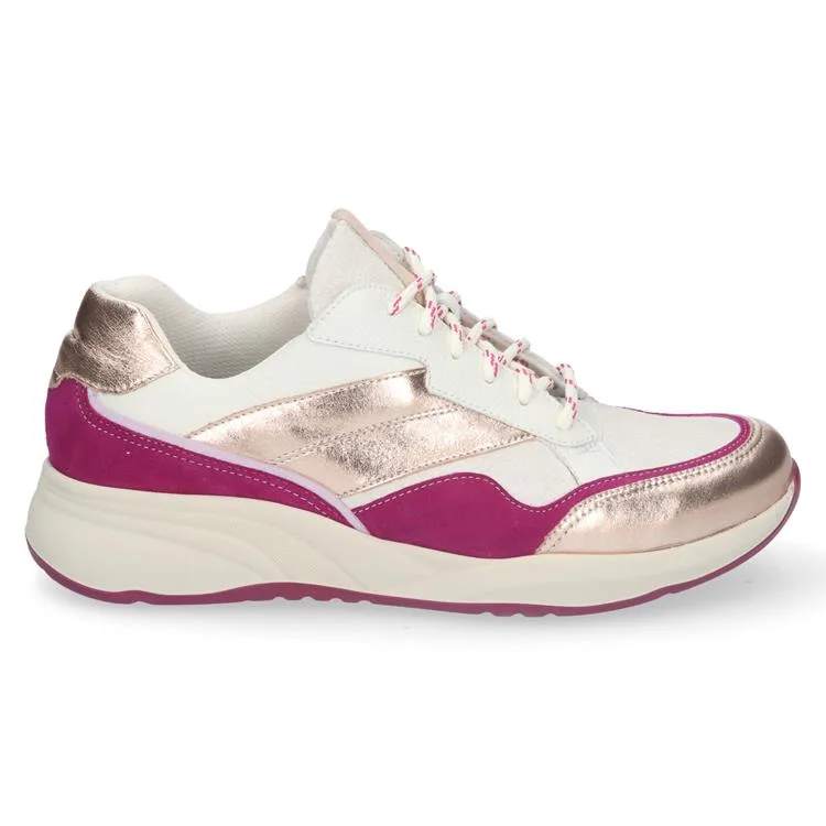Dankzij de frisse combinatie van materialen en opvallende belijningen is deze sneaker de perfecte balans tussen sport en stijl. De subtiele, afgeronde lijnen in het ontwerp geven de sneaker een zachte, elegante uitstraling en maken van dit model een veelzijdig mode-item dat past bij werkelijk elke gelegenheid: van een werklunch met collega’s tot een snelle koffie-date na je workout.Dynamische belijningen en uitgesproken accenten geven het bovenwerk karakter. Dat zie je onder meer aan het merkembleem op de tong en de mix van texturen. Aan de binnenzijde, langs de veterklep, bevindt zich een functionele rits die slim is weggewerkt in het design. Deze combinatie van veters en rits maakt het niet alleen heel eenvoudig om de sneaker aan en uit te trekken, maar zorgt er ook voor dat je de pasvorm perfect kunt aanpassen aan jouw voet.Wat je niet meteen ziet, maar wel voelt, is de extra zachte polstering bij de hiel. Deze biedt comfortabele ondersteuning aan de achterzijde van de voet. En, zoals je van Durea mag verwachten, is ook de zool ontworpen met comfort in gedachten: deze is extra licht en flexibel en zorgt voor stabiliteit en grip. Verder geeft de zool een geweldige demping en door de oplopende neus wikkelt je voet tijdens het lopen als vanzelf af. Kortom: met deze sneaker ligt de wereld aan je voeten!