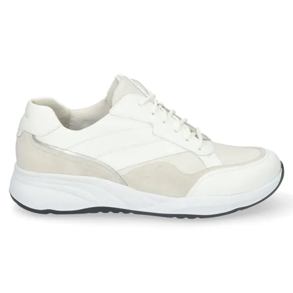 Dankzij de frisse combinatie van materialen en opvallende belijningen is deze sneaker de perfecte balans tussen sport en stijl. De subtiele, afgeronde lijnen in het ontwerp geven de sneaker een zachte, elegante uitstraling en maken van dit model een veelzijdig mode-item dat past bij werkelijk elke gelegenheid: van een werklunch met collega’s tot een snelle koffie-date na je workout.Dynamische belijningen en uitgesproken accenten geven het bovenwerk karakter. Dat zie je onder meer aan het merkembleem op de tong en de mix van texturen. Aan de binnenzijde, langs de veterklep, bevindt zich een functionele rits die slim is weggewerkt in het design. Deze combinatie van veters en rits maakt het niet alleen heel eenvoudig om de sneaker aan en uit te trekken, maar zorgt er ook voor dat je de pasvorm perfect kunt aanpassen aan jouw voet.Wat je niet meteen ziet, maar wel voelt, is de extra zachte polstering bij de hiel. Deze biedt comfortabele ondersteuning aan de achterzijde van de voet. En, zoals je van Durea mag verwachten, is ook de zool ontworpen met comfort in gedachten: deze is extra licht en flexibel en zorgt voor stabiliteit en grip. Verder geeft de zool een geweldige demping en door de oplopende neus wikkelt je voet tijdens het lopen als vanzelf af. Kortom: met deze sneaker ligt de wereld aan je voeten!