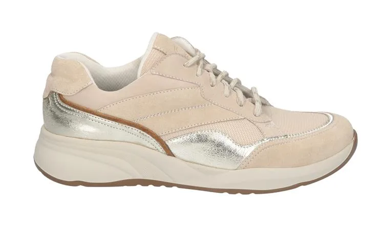Dankzij de frisse combinatie van materialen en opvallende belijningen is deze sneaker de perfecte balans tussen sport en stijl. De subtiele, afgeronde lijnen in het ontwerp geven de sneaker een zachte, elegante uitstraling en maken van dit model een veelzijdig mode-item dat past bij werkelijk elke gelegenheid: van een werklunch met collega’s tot een snelle koffie-date na je workout.Dynamische belijningen en uitgesproken accenten geven het bovenwerk karakter. Dat zie je onder meer aan het merkembleem op de tong en de mix van texturen. Aan de binnenzijde, langs de veterklep, bevindt zich een functionele rits die slim is weggewerkt in het design. Deze combinatie van veters en rits maakt het niet alleen heel eenvoudig om de sneaker aan en uit te trekken, maar zorgt er ook voor dat je de pasvorm perfect kunt aanpassen aan jouw voet.Wat je niet meteen ziet, maar wel voelt, is de extra zachte polstering bij de hiel. Deze biedt comfortabele ondersteuning aan de achterzijde van de voet. En, zoals je van Durea mag verwachten, is ook de zool ontworpen met comfort in gedachten: deze is extra licht en flexibel en zorgt voor stabiliteit en grip. Verder geeft de zool een geweldige demping en door de oplopende neus wikkelt je voet tijdens het lopen als vanzelf af. Kortom: met deze sneaker ligt de wereld aan je voeten!