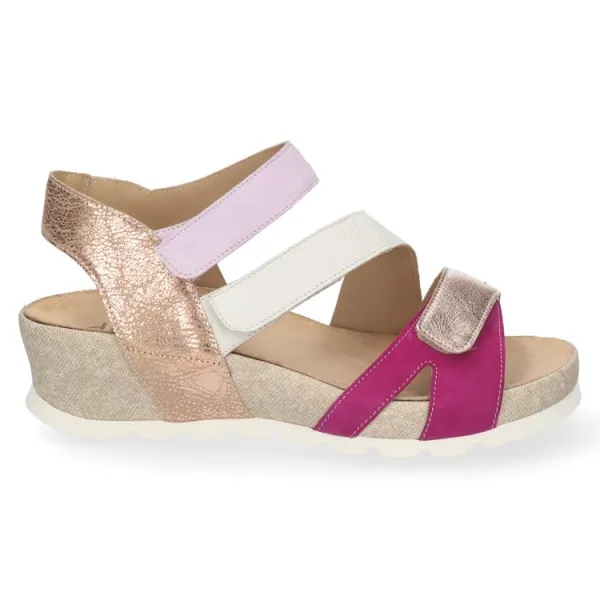 Een zomer zonder nieuwe sandalen is geen zomer. Helemaal van nu zijn deze stijlvolle stappers uitgevoerd in een spannende materialenmix. De sleehak geeft dit model een uitgesproken karakter én laat jouw benen optisch langer lijken. Door het plateau onder de voorvoet is de hak bovendien comfortabel genoeg om een mooie wandeling over de boulevard mee te maken. Draag dit paar Durea’s met een lange of juist kortere jurk voor een elegante look. Houd jij meer van een casual stijl? Onder een (korte) spijkerbroek kom je met deze sandalen ook prima voor de dag.Naast dat deze sandalen echte eyecatchers zijn, zijn ze ook nog eens zeer stevig. Het model heeft drie klittenbandsluitingen: een op de voorvoet en twee over de wreef, waarvan er een schuin over de voet loopt. De banden zijn individueel verstelbaar en zorgen ervoor dat de sandaal gegarandeerd goed aan de voet blijft zitten.Dankzij de doorlopende zool geniet je van maximale stabiliteit zonder in te leveren op looks. De zool is lichtgewicht, flexibel én voorzien van sublieme demping, waarmee deze sandaal jouw ideale metgezel is voor een zomers dagje weg.