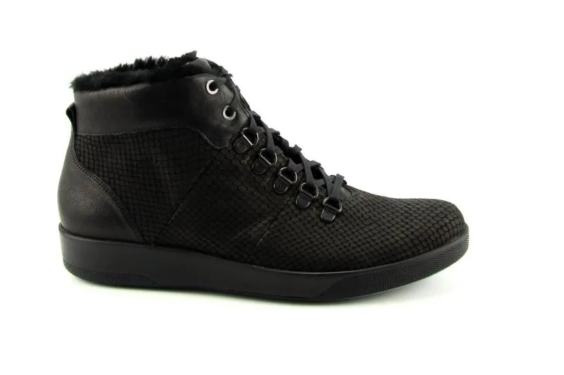Veterboot van Durea met uitneembaar voetbed. Dit model heeft een slangen print en een sier bontrandje langs de enkel. Voor de extra brede voet.
