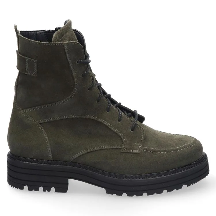 Deze halfhoge veterboots blinken uit door een stijlvolle combinatie van stoere eenvoud en vrouwelijke elegantie. Draag ze onder een midi rok en gebreide top voor een moderne look. Liever iets meer casual? Combineer ze dan met een jeans, simpele top en blazer. Afhankelijk van de pasvorm van de broek kun je ervoor kiezen om de pijpen over de laars te laten vallen of om de broek in de laars te dragen. Aan jou de keuze!Het robuuste karakter van de schoen wordt onderstreept door de dikke zool en de treklus bij de hiel, terwijl de door stikwerk gecreëerde belijningen zorgen voor een optisch slanker silhouet. Andere opvallende details zijn de hoge tong, de opstaande ‘koordnaad’ op de neus en het leren accent met geometrische sierstiksels bij de hiel. Op de tong is de schoen voorzien van een veterlus, waar je de ronde veter doorheen rijgt. Behalve de vetersluiting beschikt dit model ook over een rits aan de binnenzijde van de schacht, die het aan- en uittrekken versoepelt.De massief ogende, maar lichtgewicht zool is gemaakt van anti-slip, niet-markerend materiaal en uitgerust met extra dempend vermogen. De hak is bescheiden en heeft een brede omvang waardoor deze een uitstekende stabiliteit biedt. Tel daarbij op dat de loopzool is voorzien van een grof profiel en je begrijpt: met dit paar Durea’s sta je stevig in je schoenen, wat de dag ook brengt.