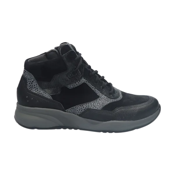 Met een comfortabel paar sneakers ligt de wereld aan je voeten. Dat geldt in het bijzonder voor dit enkelhoge exemplaar van Durea: een kruising tussen een stijlvolle, sportieve schoen en een hardloopschoen. Het model gooit hoge ogen als het gaat om slim, verfijnd design. Het bovenwerk kenmerkt zich door een elegante combinatie van materialen en bijzondere details, zoals het merkembleem op de tong en de perforaties op de neus. Ze geven de schoen een speels uiterlijk, terwijl de fraaie afwerking zorgt voor een volwassen look. De voering is gemaakt van ademend en vochtabsorberend materiaal (Dry Maxx). Niet alleen houdt dit je voeten fris en droog tijdens verschillende inspanningen, het voelt ook fluweelzacht aan en dat merk je meteen! Aan het gebruiksgemak is uiteraard ook gedacht: dankzij de veter-rits-combinatie kun je de sneaker heel gemakkelijk aan- en uitdoen én goed afstellen om de voet. Extra bijzonder is dat de vetersluiting verschillende draagopties biedt. Zo kun je de veters door de bovenste ringen rijgen en dan strikken of je kiest ervoor om de bovenste veterringen over te slaan. Daarmee komt de schoen bovenin wat losser te zitten, wat een nonchalante uitstraling geeft. Kies je voor de tweede optie? Je zal merken dat de schoen nog steeds goed om de voet sluit. Dat komt doordat één paar veterringen iets naar achteren is geplaatst.De loopzool is extra licht en flexibel door de gebruikte materialen, die door de juiste samenstelling ook zorgen voor stabiliteit en grip. Verder geeft de zool een geweldige demping en door de oplopende neus wikkelt je voet tijdens het lopen als vanzelf af.