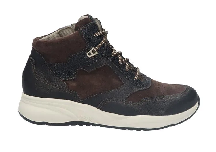 Met een comfortabel paar sneakers ligt de wereld aan je voeten. Dat geldt in het bijzonder voor dit enkelhoge exemplaar van Durea: een kruising tussen een stijlvolle, sportieve schoen en een hardloopschoen. Het model gooit hoge ogen als het gaat om slim, verfijnd design. Het bovenwerk kenmerkt zich door een elegante combinatie van materialen en bijzondere details, zoals het merkembleem op de tong en de perforaties op de neus. Ze geven de schoen een speels uiterlijk, terwijl de fraaie afwerking zorgt voor een volwassen look. De voering is gemaakt van ademend en vochtabsorberend materiaal (Dry Maxx). Niet alleen houdt dit je voeten fris en droog tijdens verschillende inspanningen, het voelt ook fluweelzacht aan en dat merk je meteen! Aan het gebruiksgemak is uiteraard ook gedacht: dankzij de veter-rits-combinatie kun je de sneaker heel gemakkelijk aan- en uitdoen én goed afstellen om de voet. Extra bijzonder is dat de vetersluiting verschillende draagopties biedt. Zo kun je de veters door de bovenste ringen rijgen en dan strikken of je kiest ervoor om de bovenste veterringen over te slaan. Daarmee komt de schoen bovenin wat losser te zitten, wat een nonchalante uitstraling geeft. Kies je voor de tweede optie? Je zal merken dat de schoen nog steeds goed om de voet sluit. Dat komt doordat één paar veterringen iets naar achteren is geplaatst.De loopzool is extra licht en flexibel door de gebruikte materialen, die door de juiste samenstelling ook zorgen voor stabiliteit en grip. Verder geeft de zool een geweldige demping en door de oplopende neus wikkelt je voet tijdens het lopen als vanzelf af.