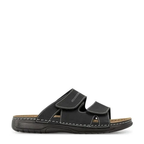 Deze heren slippers van Easy Street zijn gemaakt van imitatieleer. Ze hebben een klittenbandsluiting en een platte zool. De textielen voering zorgt voor extra draagcomfort. Perfect voor een ontspannen dagje uit.
