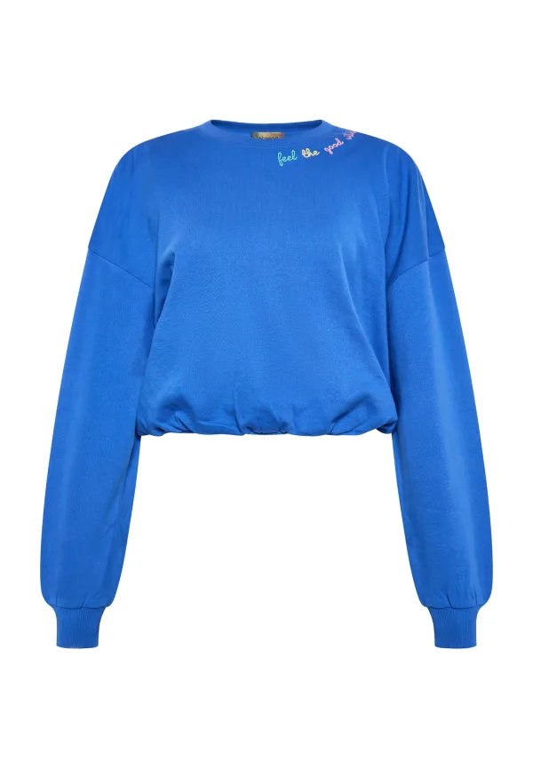Design: Overcut schouder; Materiaal: Sweatstof; Halstype: Ronde hals; Motief: Tekst print; Details: Borduursels, Gedrapeerd; Extra's: Voelt zacht aan; Pasvorm: Normale pasvorm; Armlengte: Lange mouw; Lengte: Korte pasvorm