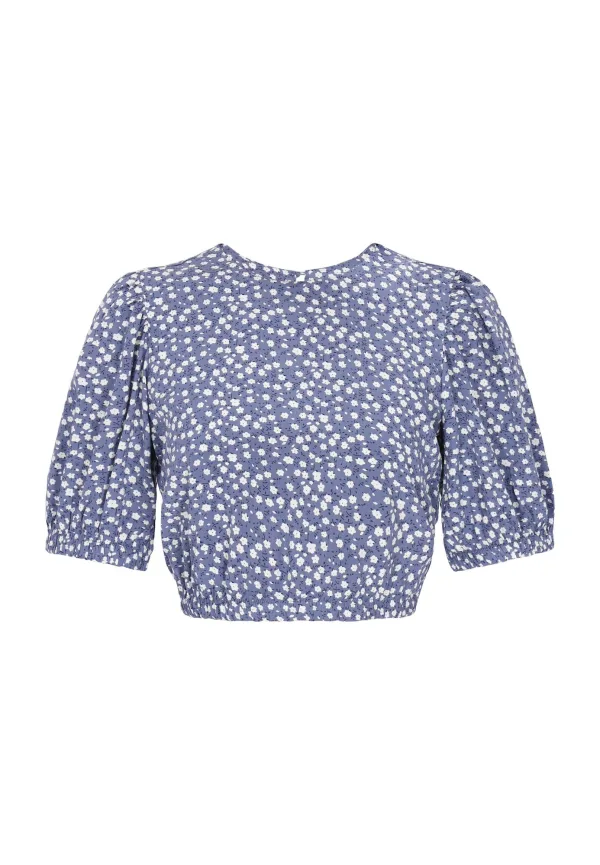 Blouse type: Blouseshirt; Design: Pofmouwen; Type sluiting: Knoopsluiting; Materiaal: Viscose; Motief: Bloemenprint; Kraag: Zonder kraag; Details: Cut-outs, Gedrapeerd; Extra's: All-over patroon; Pasvorm: Normale pasvorm; Armlengte: Halve mouw; Lengte: Korte pasvorm