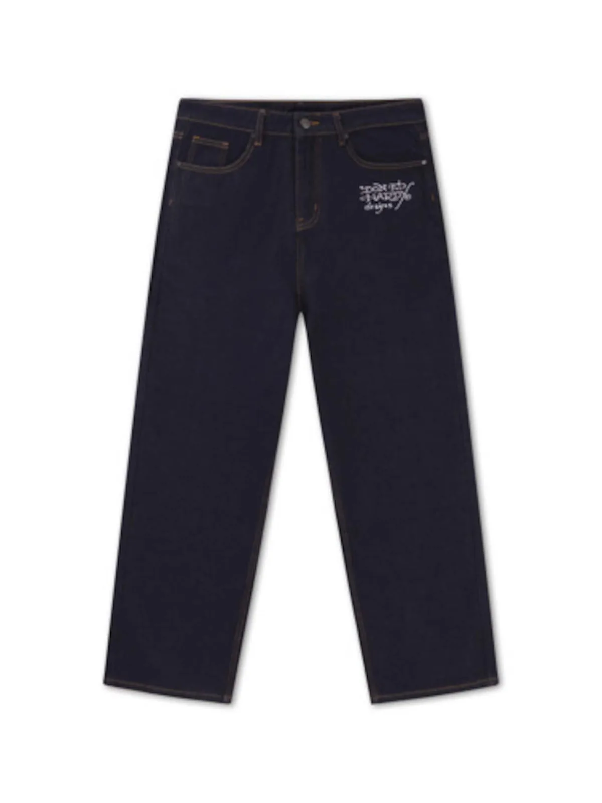 Design: Ritssluiting, 5-pocket-style; Type sluiting: Ritssluiting; Materiaal: Denim; Motief: Logoprint; Extra's: Applicaties, Label borduurwerk; Wassing: Rinsed/dark washed; Lengte: Lang/maxi; Pasvorm: Loosefit