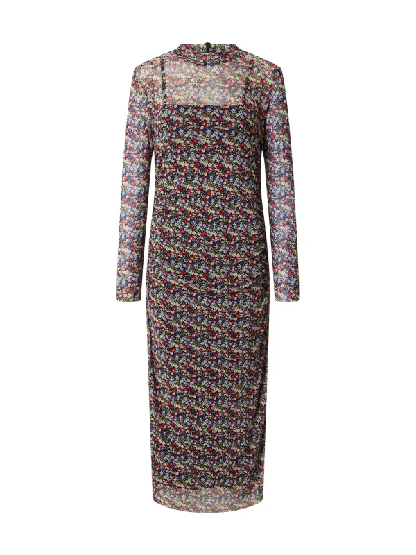 Design: Rechte zoom, Met onderjurk, Rug rits; Type sluiting: Ritssluiting; Halstype: Opstaande kraag; Motief: Bloemenprint; Details: Gedrapeerd; Extra's: Licht transparant, All-over patroon, Gladde stof; Lengte: 7/8 lengte; Pasvorm: Slanke pasvorm; Armlengte: Lange mouw