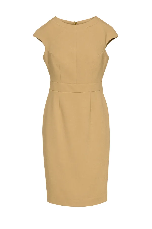Effen camelkleurige jurk met kapmouwen. Prijzen