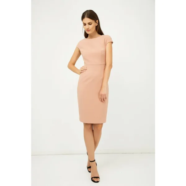 Effen kleed in geweven kreukelstijl stof met een lichte stretch. Korte kapmouwtjes en een ronde halslijn. Decoratieve naden aan de voorkant bij de borst. Een tailleband van 4 cm in dezelfde stof. Figuurnaden boven en onder de tailleband voor de perfecte pasvorm. Twee naden bij de borst. Verborgen ritssluiting aan de achterkant, 48 cm. Split aan de achterkant, 9 cm. Gevoerd. Smal, matig aansluitend silhouet. Lengte voor maat 38: 102 cm. Ons model is 178 cm lang en draagt maat 36.