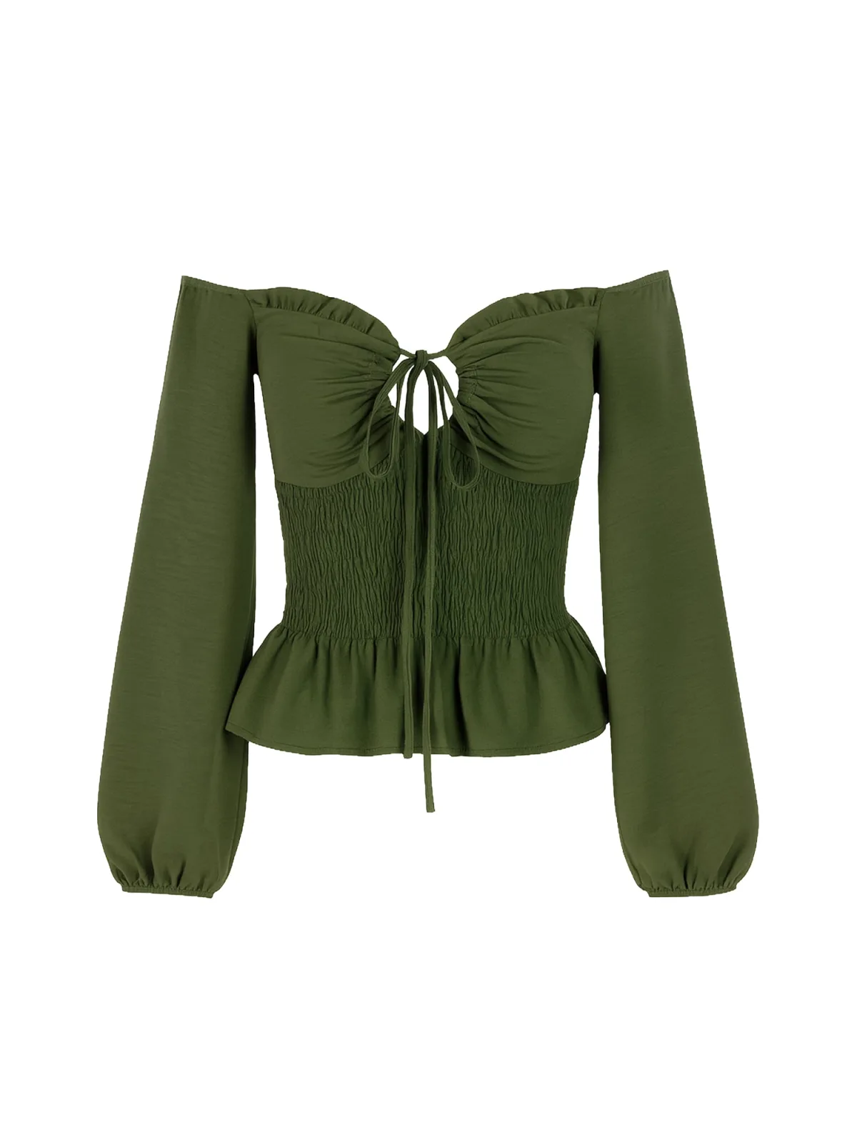 Blouse type: Blouseshirt; Design: Met band/snoer; Type sluiting: Open; Motief: Effen; Kraag: Zonder kraag; Details: Cut-outs, Ruches, Gedrapeerd; Extra's: Op staal naden; Pasvorm: Slanke pasvorm; Armlengte: Lange mouw; Lengte: Korte pasvorm