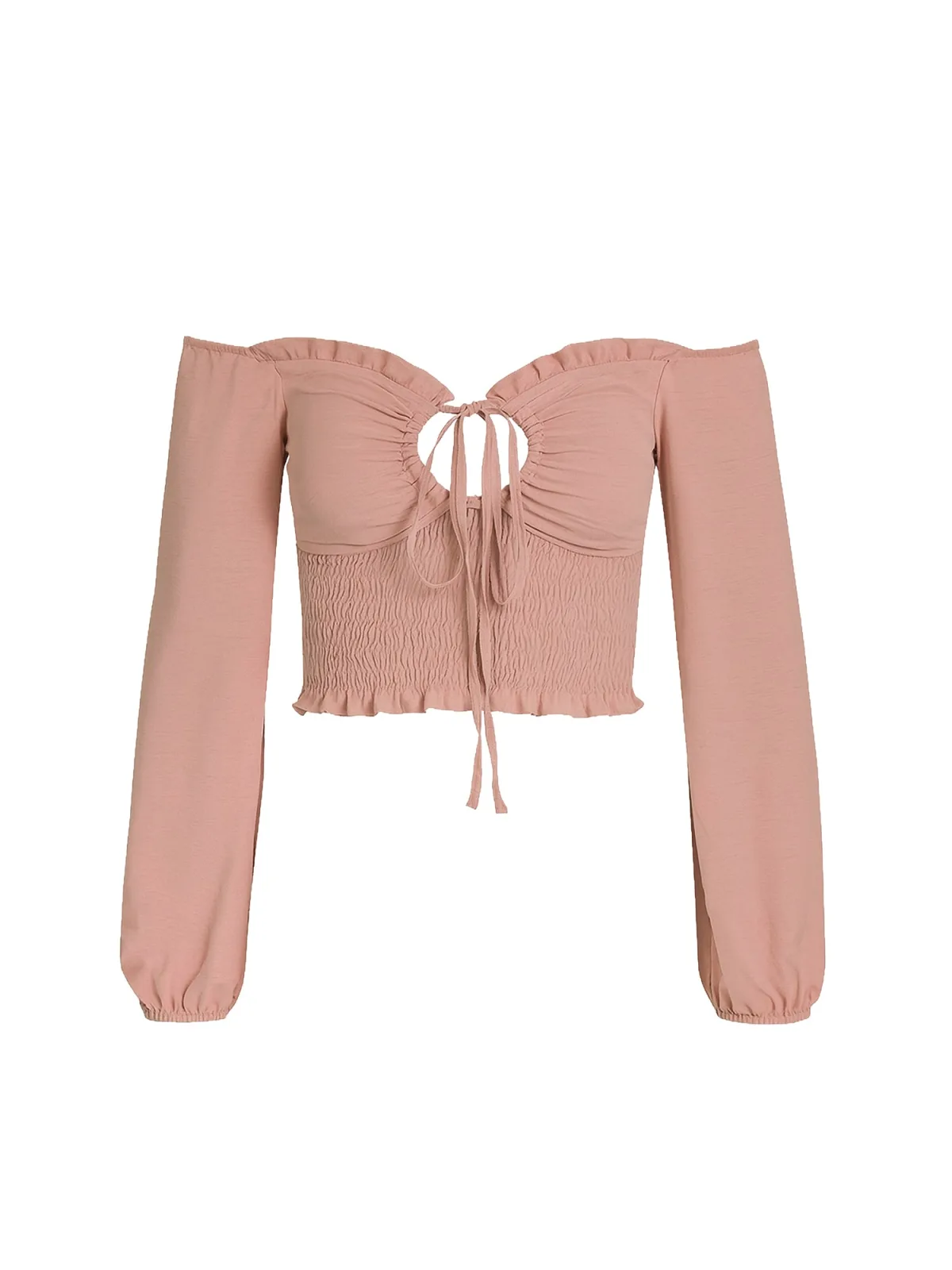 Blouse type: Blouseshirt; Design: Strapless/off-shoulder, Elastische inzetstukken; Type sluiting: Open; Motief: Effen; Kraag: Zonder kraag; Details: Cut-outs, Ruches, Gedrapeerd; Extra's: Gladde stof; Pasvorm: Slanke pasvorm; Armlengte: Lange mouw; Lengte: Korte pasvorm