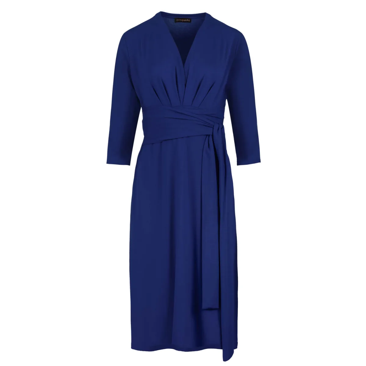 Electric Blue jurk van stretch jerseystof, viscose-elastaan. Driekwart mouwen met een diepe V-hals met plooien aan de linker- en rechterkant. Naaddetail onder de borst met plooien eronder. Riem van dezelfde stof aan de zijkanten vastgemaakt. Empire-lijn met een A-lijnsilhouet.