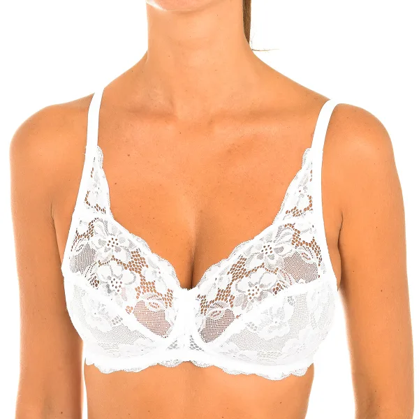 Eleganter BH ohne Kabel. weiße Farbe Hergestellt aus Spitze und Chiffon für einen ultra femininen und raffinierten Stil. Tassen ohne Schaum. Elastische und verstellbare Träger. Rückenverschluss mit dreistelligen Verschlüssen. Elastische Seiten. Passende sichtbare Nähte. Komposition: 85% Polyamid - 15% Elasthan. - Pflege: - Handwäsche. - Benutzen Sie keine Bleiche. - Verwenden Sie keinen Trockner. - Kein Bügeln. - Reinige chemisch nicht.