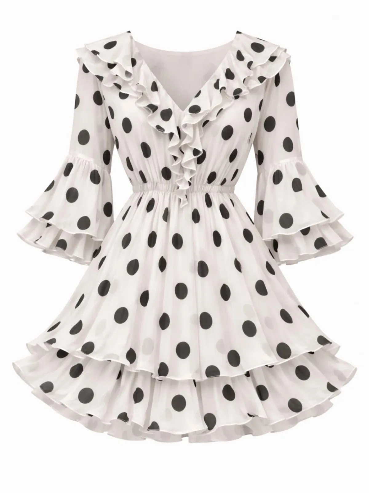 Materiaal: Chiffon; Halstype: Ruches kraag; Motief: Gestippeld; Soort bandjes: Normale bandjes; Details: Volant; Lengte: Kort/mini; Pasvorm: Normale pasvorm; Armlengte: Lange mouw