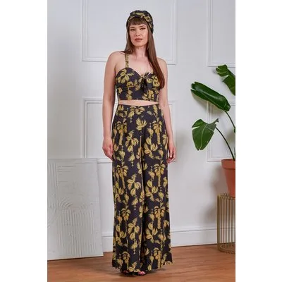 “Palm trees & golden dreams.” Deze Elizabeth Golden Hour pantalon brengt je regelrecht naar de zon! Een wijde high waist pantalon, uitgevoerd in een soepele en luchtige zwarte 100% viscose (stretcht niet!), voorzien van een goudkleurige palmbomenprint. * High waist voor een super vrouwelijk silhouet * Rits- en haaksluiting zijkant * Rechte, wijde pijpen * De afgebeelde top is helaas niet verkrijgbaar in onze shop