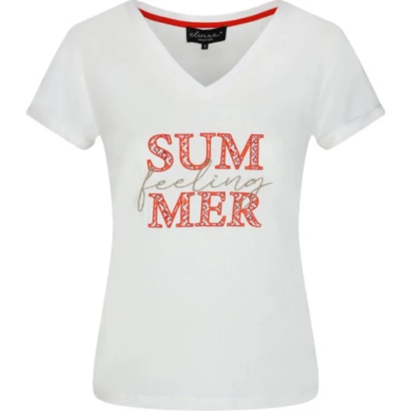 Dit prachtige off-white t-shirt van Elvira Casuals mag niet ontbreken in jouw kledingkast! Het shirt is gemaakt van zachte en comfortabele materialen, namelijk 95% viscose en 5% elastaan. Hierdoor sluit het shirt perfect aan op jouw lichaam en ervaar je een ultiem draagcomfort.en#10;en#10;Het t-shirt heeft een klassieke ronde hals en korte mouwen, waardoor het perfect is voor de warmere dagen. Daarnaast is de off-white kleur makkelijk te combineren met verschillende outfits. Draag het shirt bijvoorbeeld op een stoere spijkerbroek of juist op een elegante rok.en#10;en#10;De mooie pasvorm en het subtiele Elvira Casuals logo op de borst maken dit shirt een echte must-have voor elke trendy dame. Wacht dus niet langer en voeg dit prachtige t-shirt toe aan jouw collectie! Shop nu dit t-shirt km dames van het merk Elvira Casuals bij Nummer Zestien en creëer de perfecte casual look.