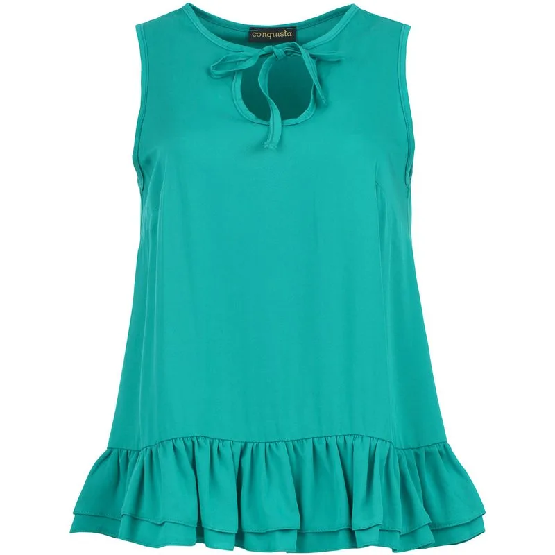 Geef je look een vleugje levendige charme met onze Emerald Breeze Ruffle Hem Top. Dit mouwloze stuk, in opvallend felgroen, heeft een speelse zoom met ruches en een elegante keyhole halslijn met een strikje. Perfect voor een veelzijdige styling.
