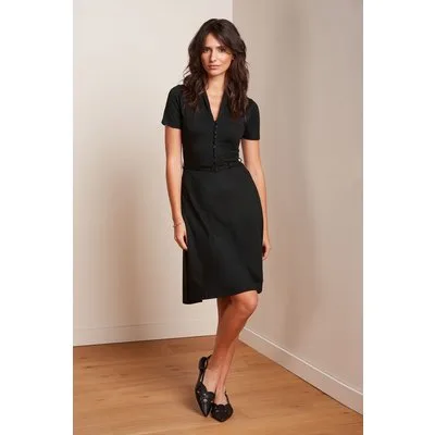 Deze Emmy jurk is alles wat je nodig hebt! Ze is speels maar toch heel vrouwelijk door haar aansluitende top met V-halslijn, sjaalkraagje, korte mouwen en reeks knoopjes. De taille wordt mooi geaccentueerd door het striklintje van waaruit ze over gaat in een zwierige semi-swing rok. Uitgevoerd in een heerlijk soepele en stretchy zwarte EcoVero viscosemix. Zeg maar 'hallo' tegen je nieuwe favoriete jurk! * Sjaalkraagje * V-halslijn * Korte mouwen * Knopenrij aan de voorzijde * Afneembare riem, voor een extra 'snatched' taille * Valt bij een lengte van 1,70 m boven de knie