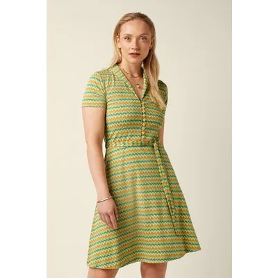 Deze Emmy jurk is alles wat je nodig hebt dit seizoen! Ze is speels maar toch heel vrouwelijk door haar aansluitende top, flatterende korte mouwtjes en reeks knoopjes. De taille wordt mooi geaccentueerd door het striklint vanwaar ze uitloopt in een flowy rok. Uitgevoerd in een heerlijk soepele en stretchy bio katoenmix met een retro print in geel en groentinten. * V-halslijn met omslagkraagje * Korte mouwen * Knopenrij * Afneembaar striklint voor een extra 'snatched' taille * Valt bij een lengte van 1,70 m boven de knie