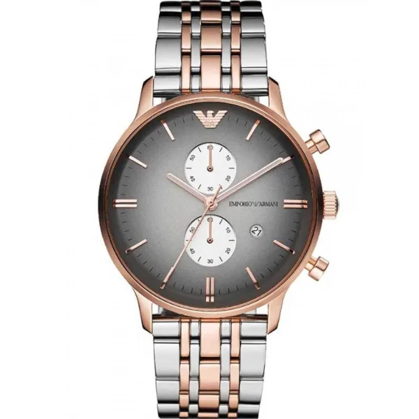 Emporio Armani AR1721 Classic herenhorloge. Dit oversized herenhorloge van Emporio Armani heeft een roségoudkleurige en fijn bewerkte roestvrijstalen kast en armband, aangedreven door een chronograaf quartz uurwerk. EAN 4053858003514