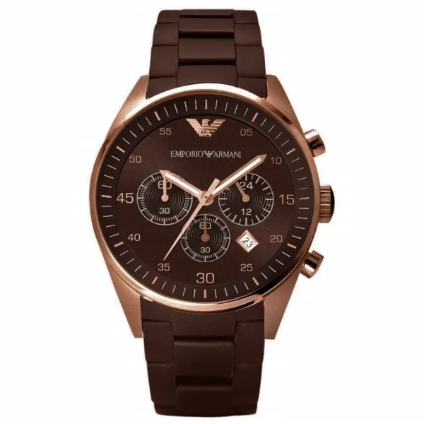 Stijlvolle AR5890 Rose Gold Brown EMPORIO ARMANI WATCH EAN 4048803842058 met een PVD rose plating ronde kast. Dit gestroomlijnde horloge heeft een aantrekkelijke bruine wijzerplaat met datum en chronograaf.