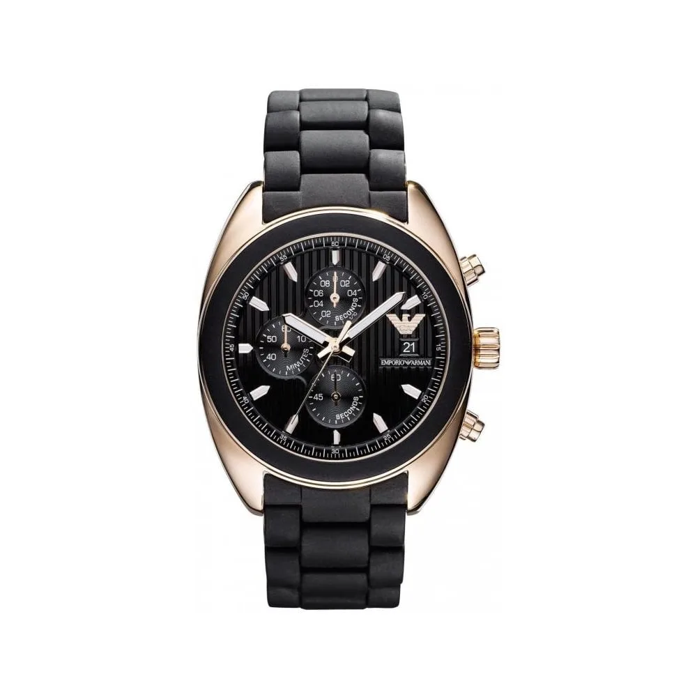 Stijlvolle AR5954 Rose Gold Black EMPORIO ARMANI WATCH EAN 4051432274381met een PVD rose plating ronde kast. Dit gestroomlijnde horloge heeft een aantrekkelijke zwarte wijzerplaat met datum en chronograaf.