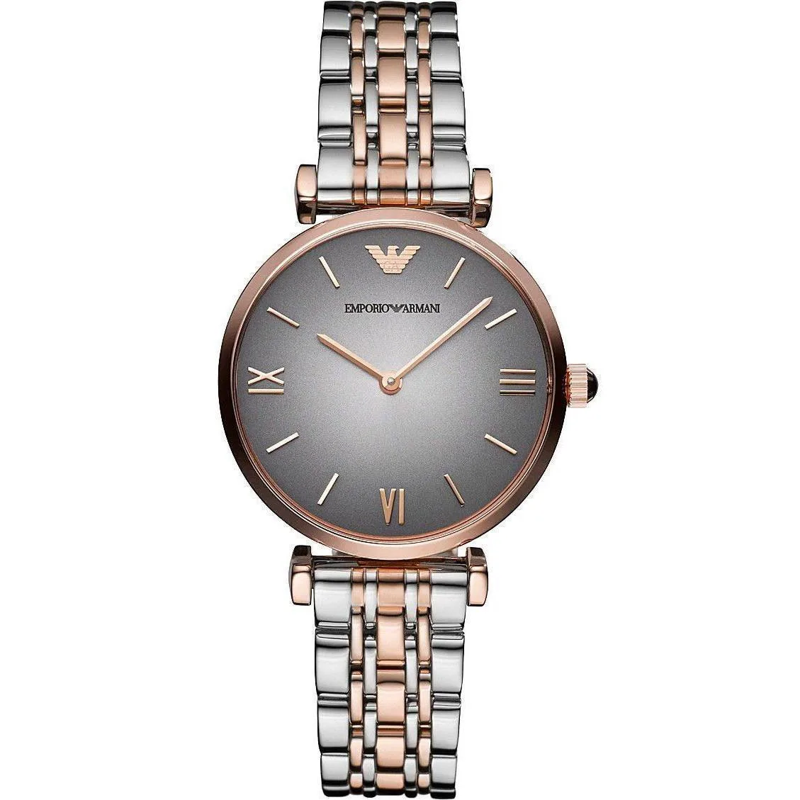 AR1725 Emporio Armani klassiek tweekleurig designerhorloge voor dames. Dit horloge is voorzien van een quartz uurwerk en heeft een tweekleurige gepolijste roestvrijstalen en rosegouden horlogeband en een grijze wijzerplaat met rosegouden slanke uurmarkeringen en bijpassende wijzers. EAN 4053858003552